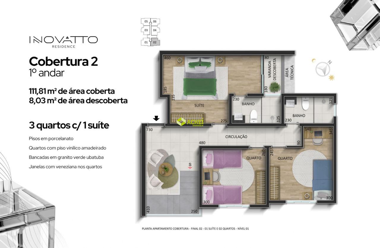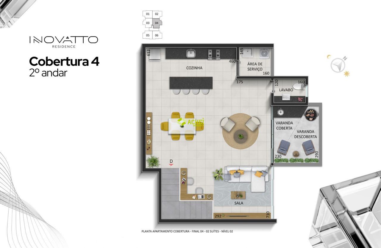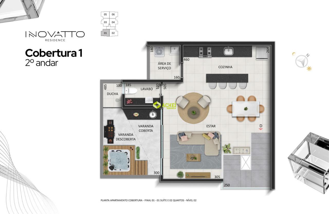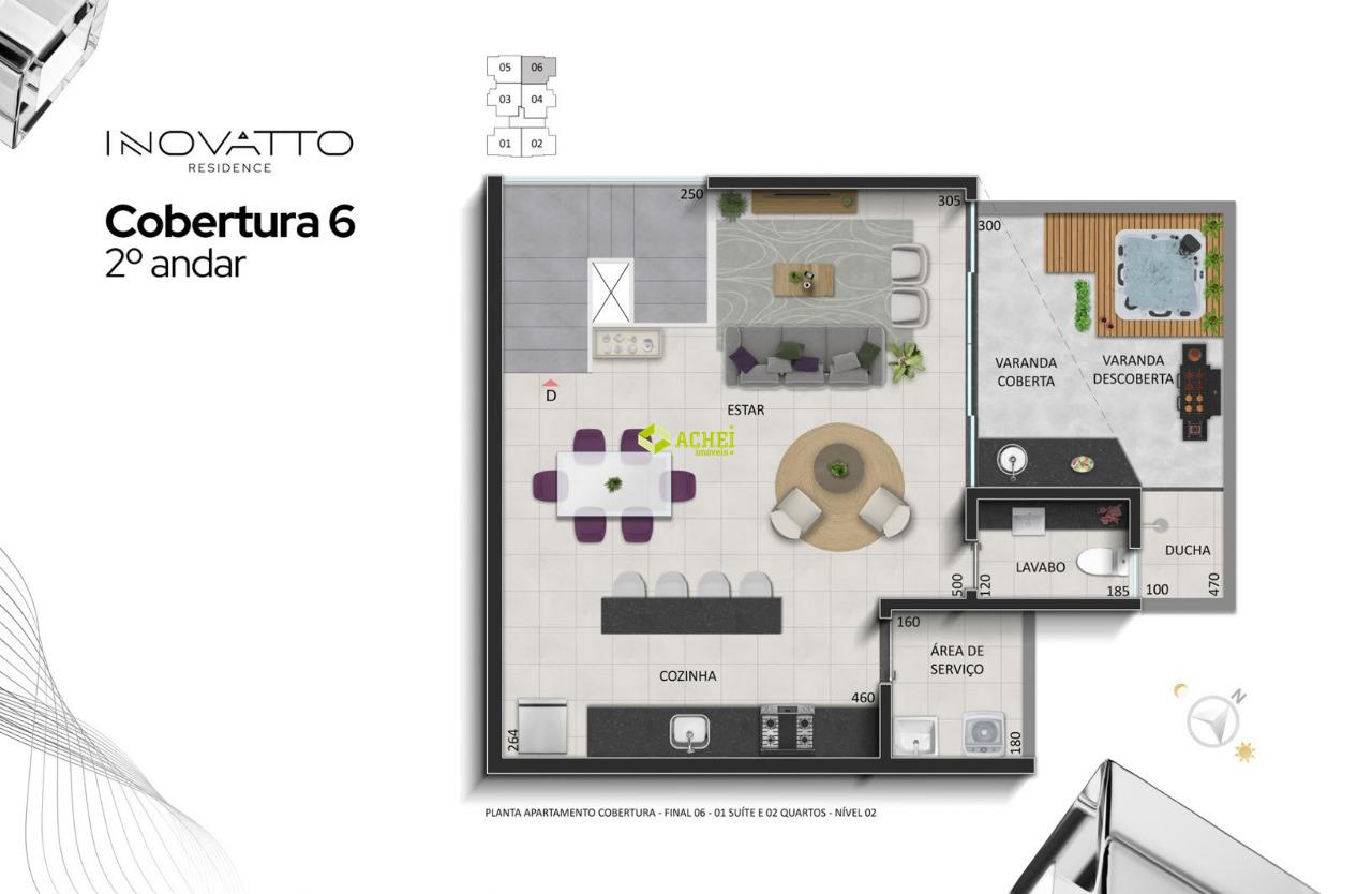 Apartamento cobertura 02 quartos sendo 01 suíte, sala, banho social, cozinha, área de serviço e área privativa. Imóvel com piso em porcelanato e vinilico amadeirado. Vaga de garagem coberta para 1 veículo. Prédio com gás canalizado, agua individual, playground, academia, salão de festas, portaria 24 horas, portão eletrônico e elevador. PREVISÃO DE ENTREGA PARA 02/2027.