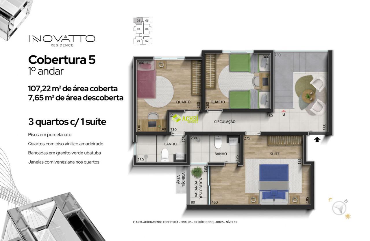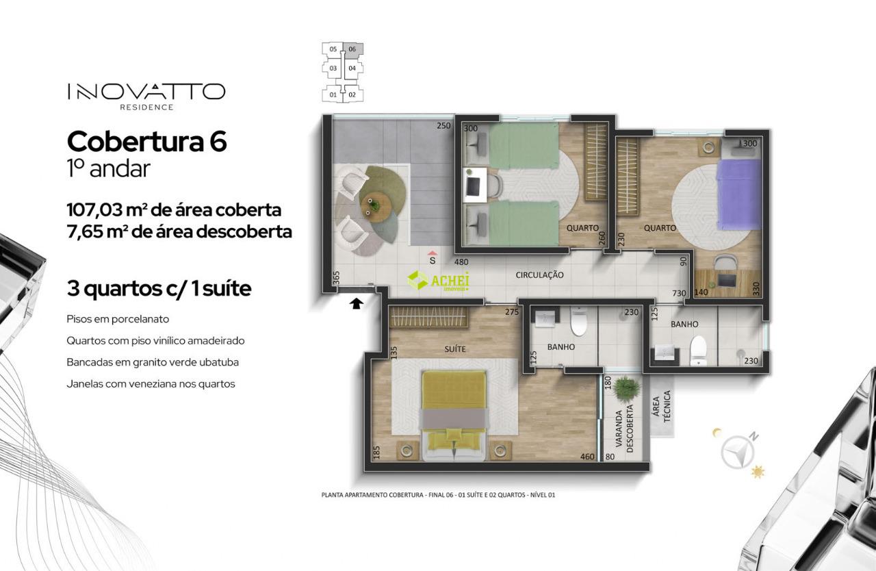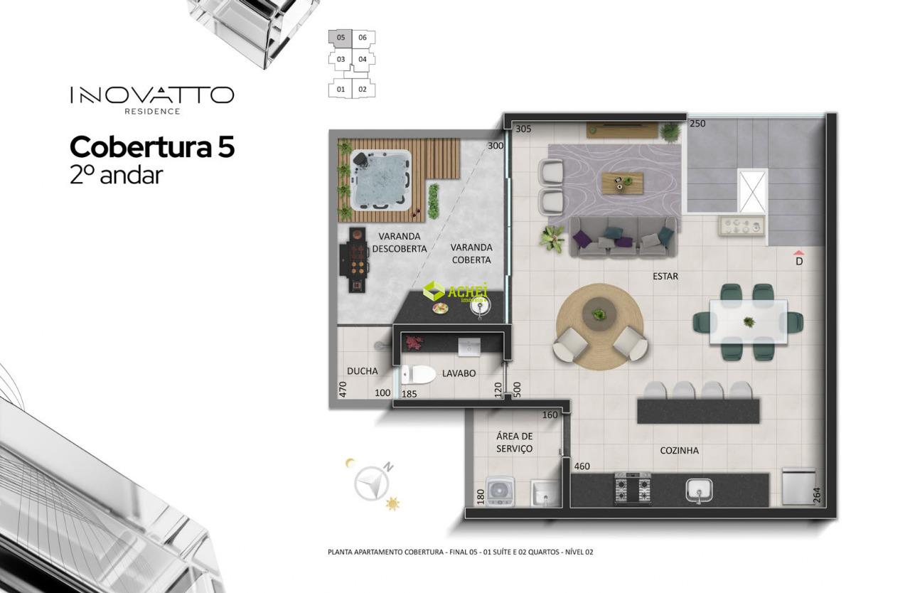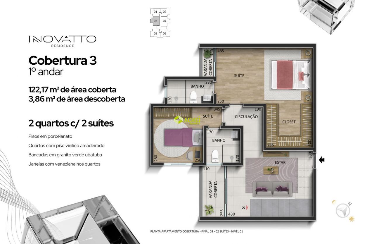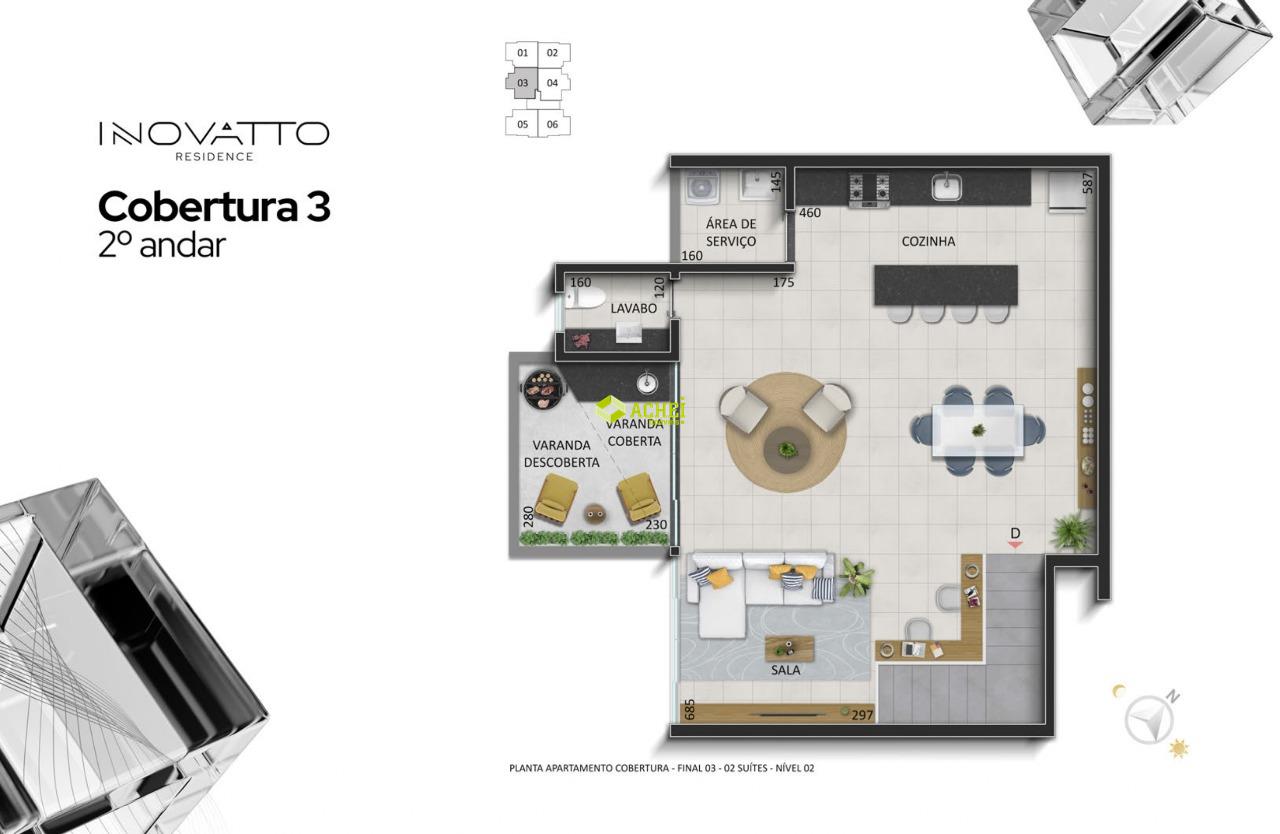 Apartamento cobertura 02 quartos sendo 01 suíte, sala, banho social, cozinha, área de serviço e área privativa. Imóvel com piso em porcelanato e vinilico amadeirado. Vaga de garagem coberta para 1 veículo. Prédio com gás canalizado, agua individual, playground, academia, salão de festas, portaria 24 horas, portão eletrônico e elevador. PREVISÃO DE ENTREGA PARA 02/2027.