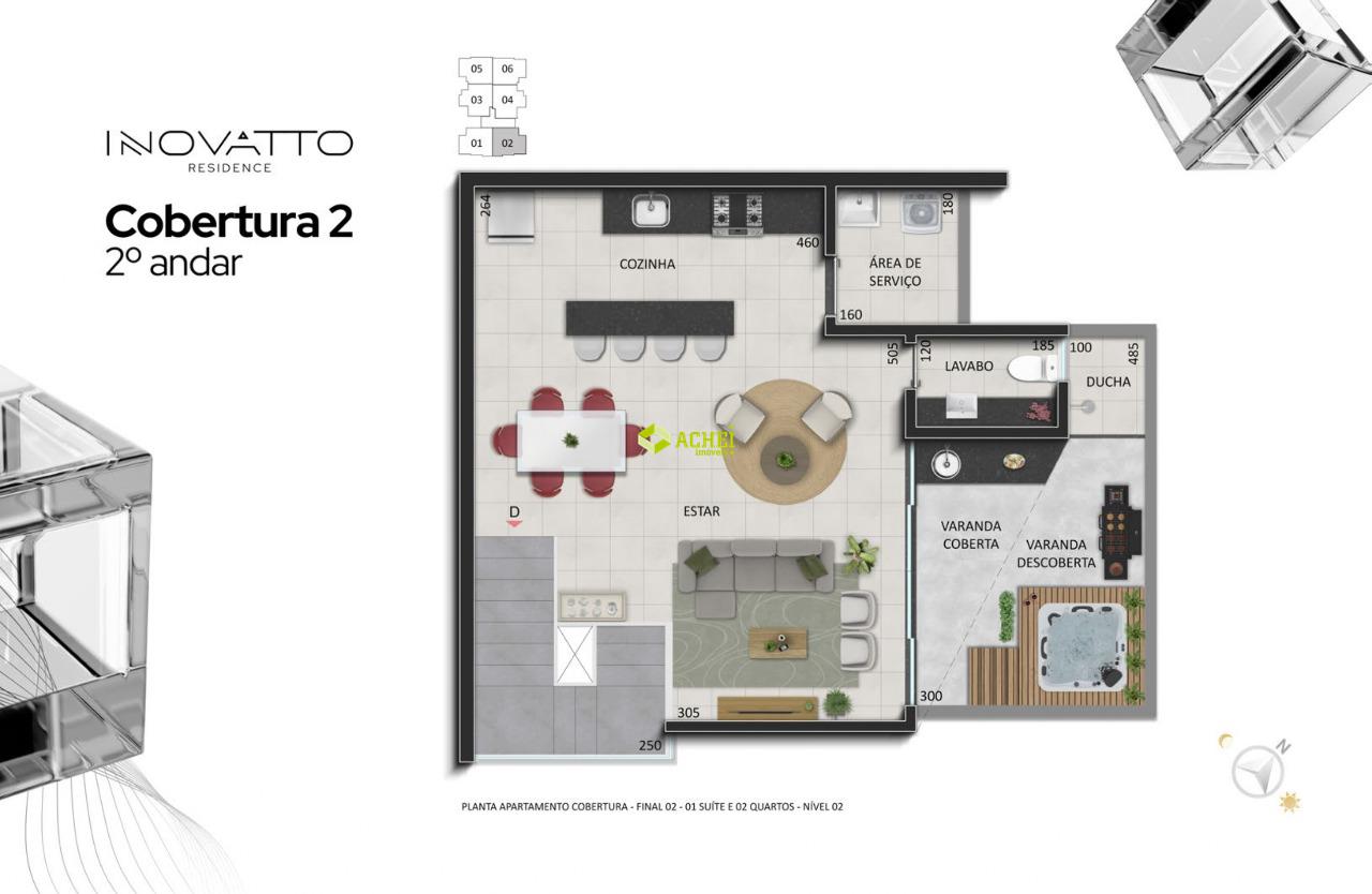 Apartamento cobertura 02 quartos sendo 02 suítes, sala, cozinha e área de serviço. Imóvel com piso em porcelanato e vinilico amadeirado. Vagas de garagem cobertas e paralelas para 02 veículos. Prédio com gás canalizado, agua individual, playground, academia, salão de festas, portaria 24 horas, portão eletrônico e elevador. PREVISÃO DE ENTREGA PARA 02/2027.