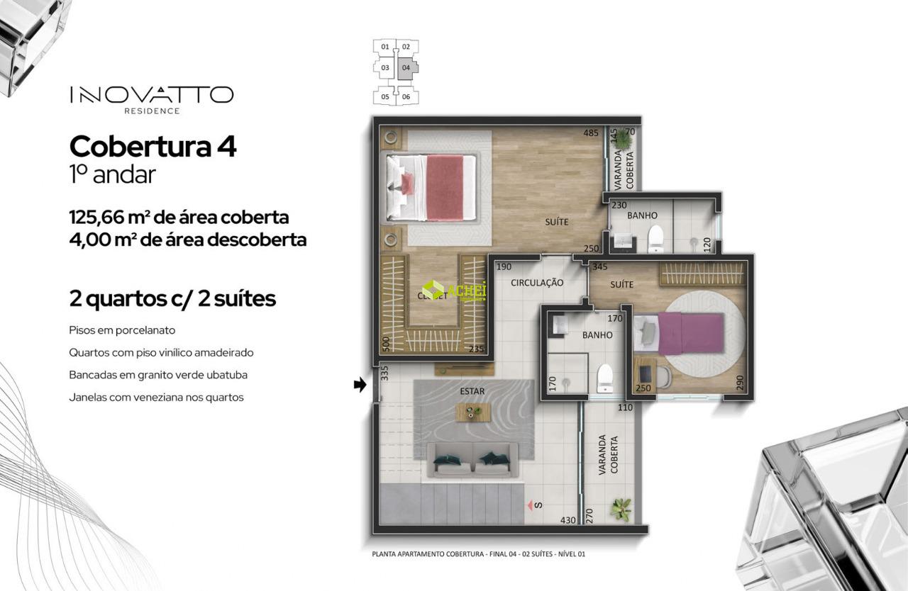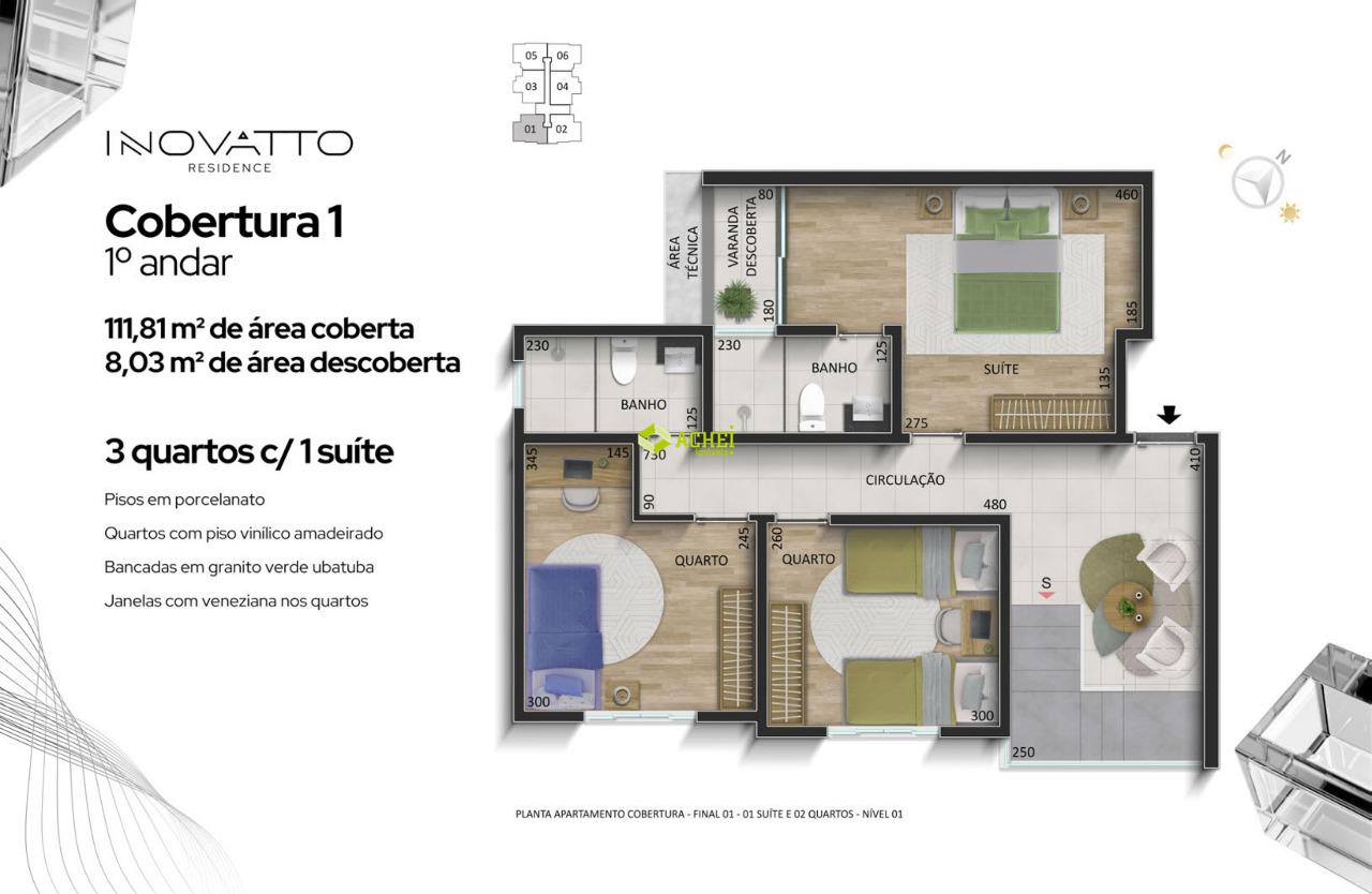Apartamento cobertura 03 quartos sendo 01 suíte, sala, banho social, cozinha e área de serviço. Imóvel com piso em porcelanato e vinifico amadeirado. Vagas de garagem cobertas para 02 veículos. Prédio com gás canalizado, agua individual, playground, academia, salão de festas, portaria 24 horas, elevador, portão eletrônico e elevador. PREVISÃO DE ENTREGA PARA 02/2027.