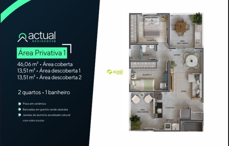 Apartamento com área privativa com 02 quartos, sala, banho social, cozinha e área de serviço. Imóvel com piso em cerâmica. Vaga de garagem para 01 veiculo. Prédio com elevador, gás canalizado, água individual, salão de festas, portão eletrônico e interfone. PREVISÃO DE ENTREGA 30 MESES.