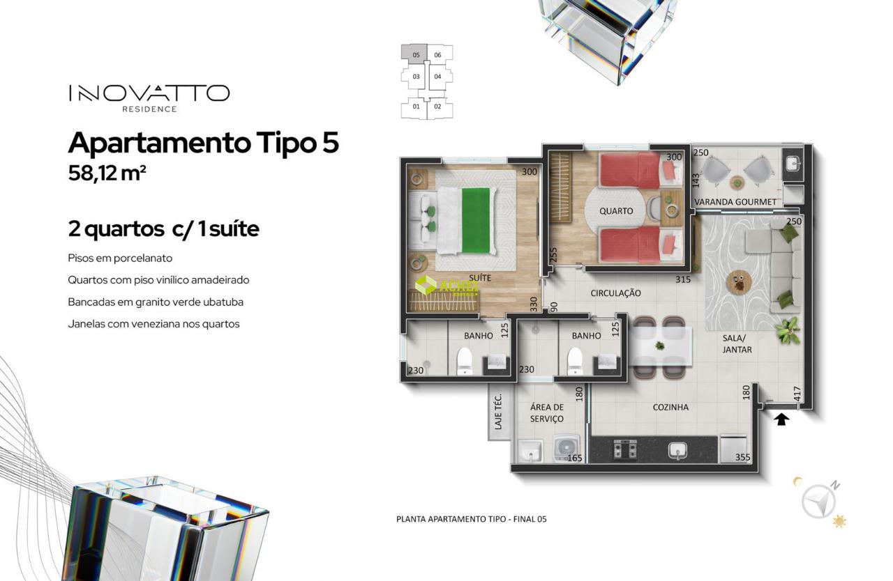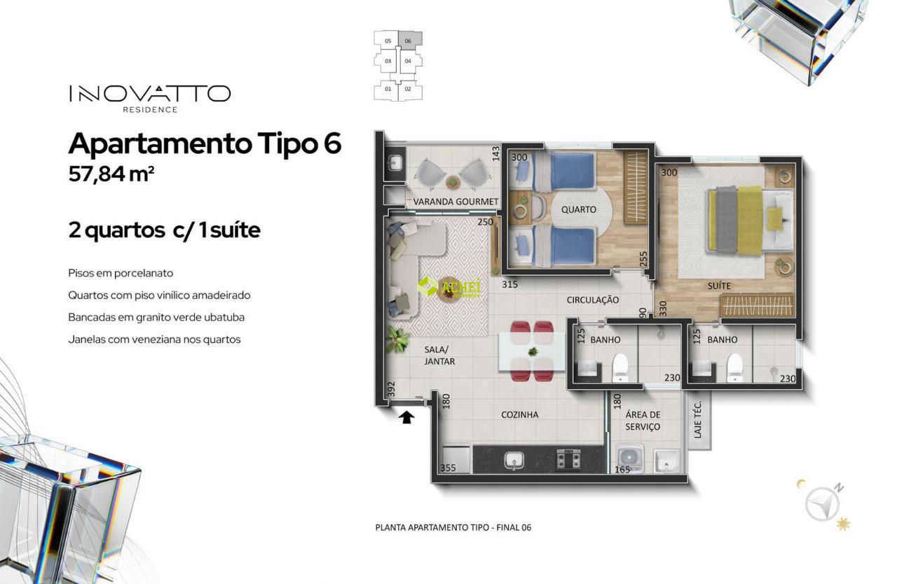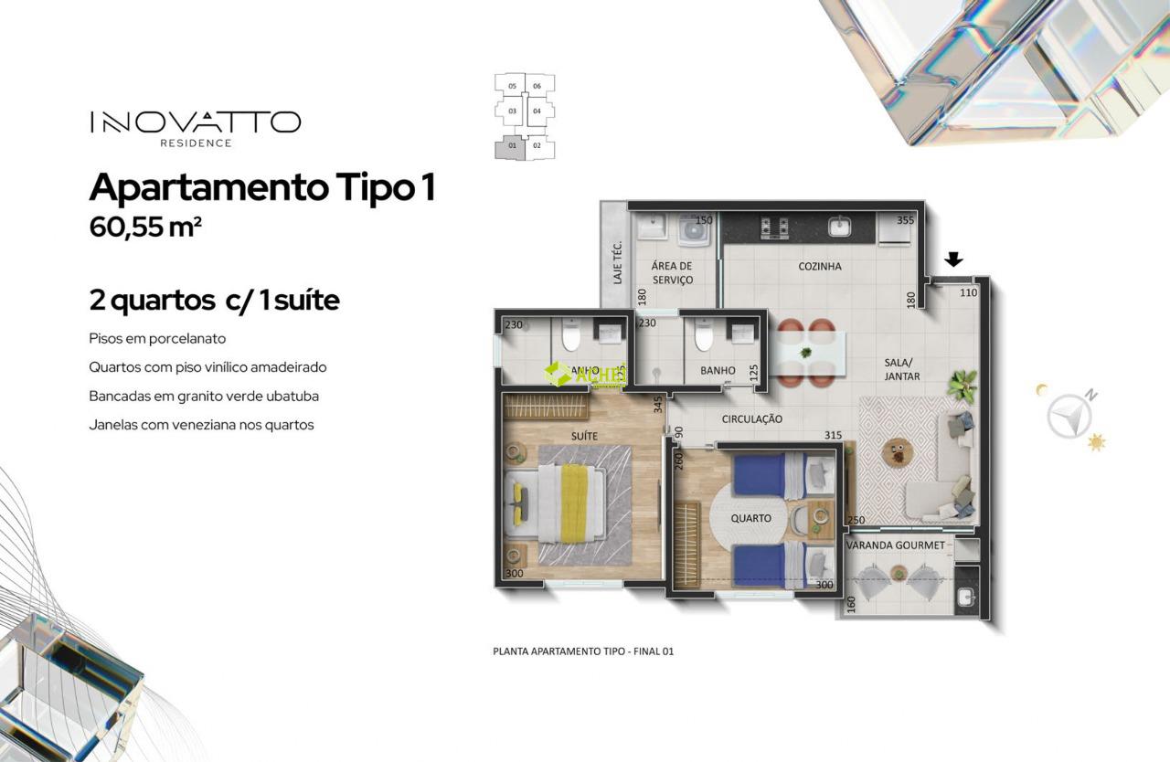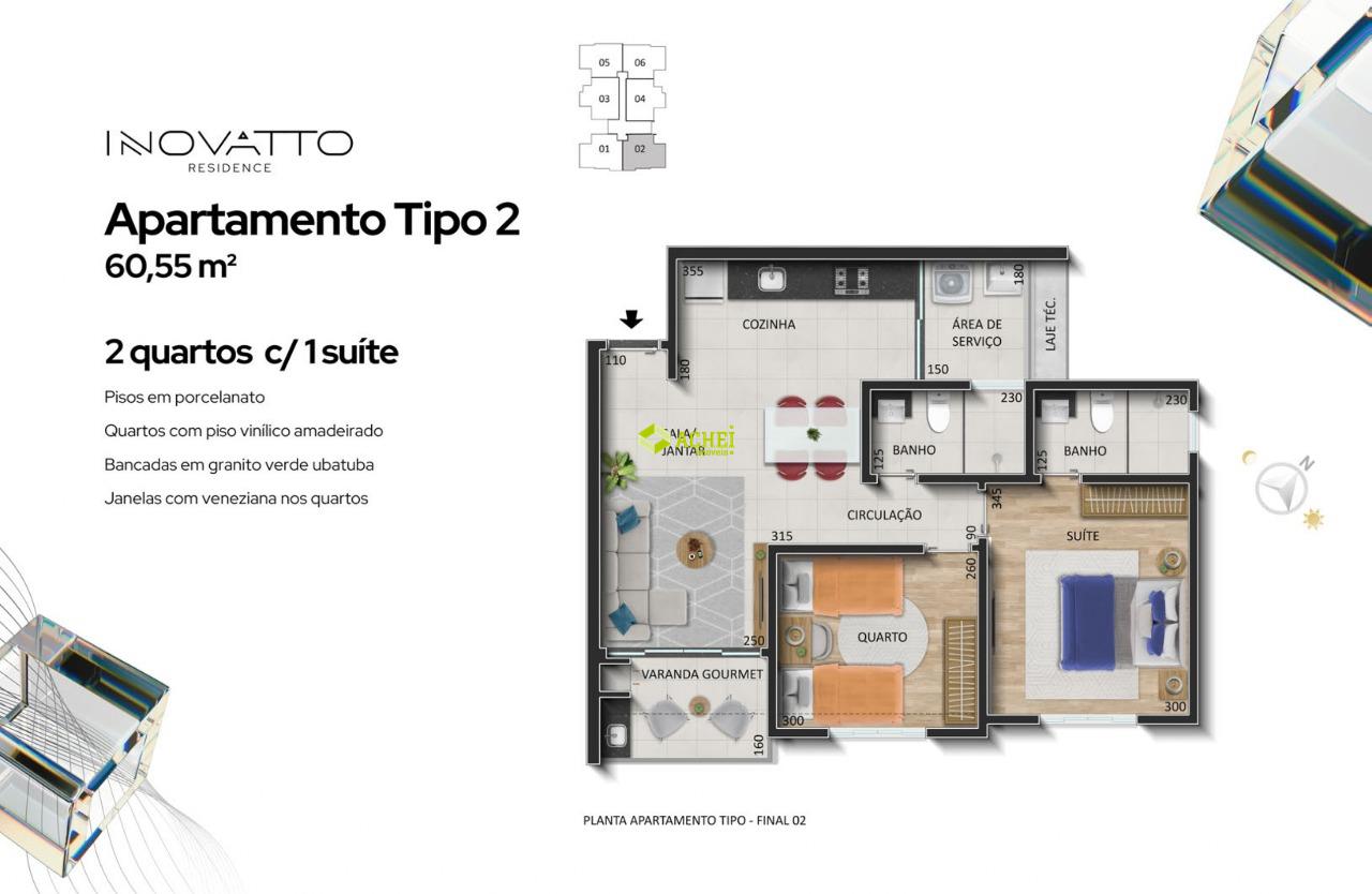 Apartamento com 02 quartos sendo 01 suíte, sala, banho social, cozinha e área de serviço. Imóvel com piso em porcelanato e vinilico amadeirado. Vaga de garagem coberta para 01 veiculo. Prédio com gás canalizado, agua individual, playground, academia, salão de festas, portaria 24 horas, elevador, portão eletrônico e elevador. PREVISÃO DE ENTREGA PARA 02/2027.