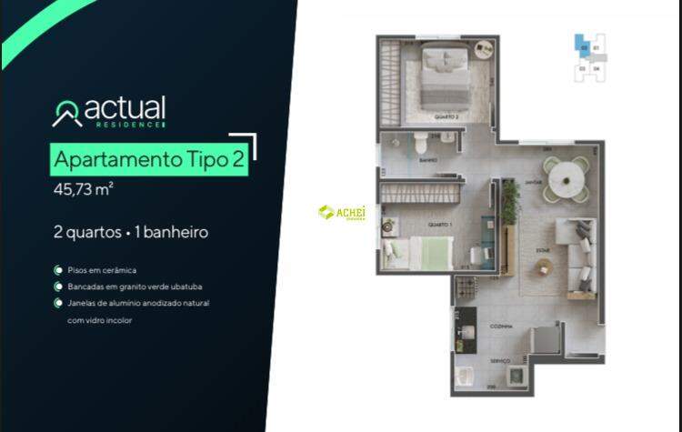 Apartamento com 02 quartos, sala, banho social, cozinha e área de serviço. Imóvel com piso em cerâmica. Vaga de garagem para 01 veiculo. Prédio com elevador, gás canalizado, água individual, salão de festas, portão eletrônico e interfone. PREVISÃO DE ENTREGA 30 MESES.