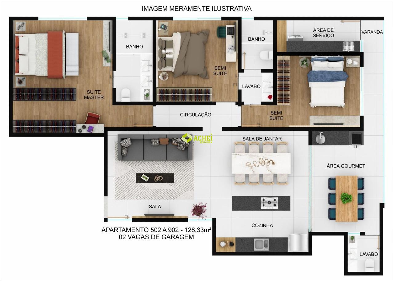Apartamento com 03 quartos sendo 01 suíte e 02 semi suítes, sala, copa, banho social com box, cozinha, varanda gourmet, lavabo e área de serviço. Imóvel com piso em porcelanato e laminado. Vagas de garagem cobertas para 02 veículos. Prédio com elevador, portão eletrônico e interfone. PREVISÃO DE ENTREGA 2026.