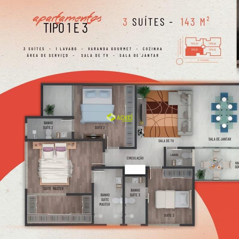 Apartamento com 03 quartos (sendo 03 suítes), sala, banheiro social, cozinha, área de serviço e varanda. Imóvel com piso em porcelanato. Vagas de garagem cobertas e paralelas para 02 veículos. Prédio com elevador, portão eletrônico e interfone. PREVISÃO DE ENTREGA 10/2027.